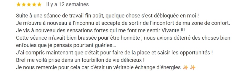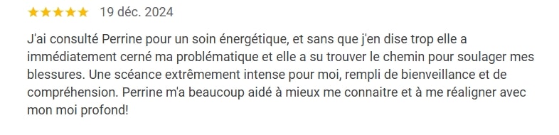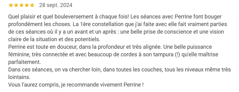 « J’ai vu Perrine pour une Constellation. En arrivant, je ne savais pas si j’allais être capable de lâcher le mental. Très vite, avec Perrine, je me suis senti à l’aise, et grâce à son accompagnement, la séance s’est déroulée avec une étonnante fluidité ✨